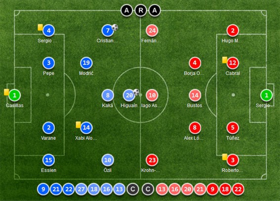 Chưa dừng lại ở đó, chấn thương của Sami Khedira còn khiến Mou phải sử dụng Luka Modric đá cặp với Xabi Alonso ở trung tâm hàng tiền vệ. Mesut Ozil và Kaka cùng góp mặt trong đội hình xuất phát. Các chuyên gia của AS cho rằng đây là cách bố trí thiếu hợp lí của Người đặc biệt.