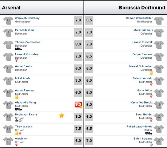 Nhưng ở trận đấu này, người ta chỉ ca ngợi Van Persie ở khả năng dứt điểm hoàn hảo của một tiền đạo, chứ không phải ngôi sao thực sự của trận đấu. Vinh dự đó lần này thuộc về Alex Song. Tiền vệ người Cameroon không chỉ làm quá tốt nhiệm vụ phòng ngự từ xa, mà còn kiến tạo cơ hội cho Van Persie ghi bàn như một tiền vệ sáng tạo đích thực. Tình huống đi bóng kĩ thuật vượt qua 3 cầu thủ của Dortmund rồi tung ra một đường chuyền “chuẩn không cần chỉnh” cho Van Persie ghi bàn mở tỉ số đã giúp Song chinh phục được tất cả những khán giả khó tính nhất. Chính vì thế, điểm 9 cho tiền vệ người Cameroon trong trận này là một điều hoàn toàn dễ hiểu.
