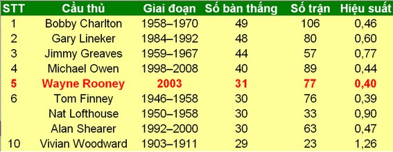 Rooney đã có được 31 bàn thắng trong 77 lần khoác áo ĐTQG. Tính trung bình, anh cần 2,5 trận đấu để ghi được 1 bàn thắng. Như vậy, để có thêm 19 bàn thắng, chân sút Quỷ đỏ cần khoảng 50 lần khoác áo ĐT Anh nữa để vươn lên dẫn đầu danh sách ghi bàn.