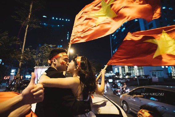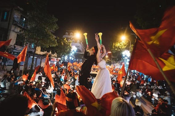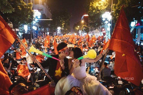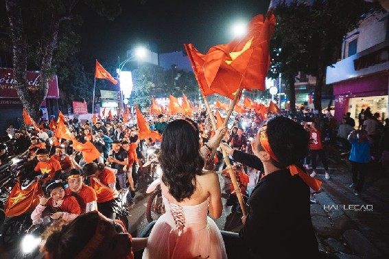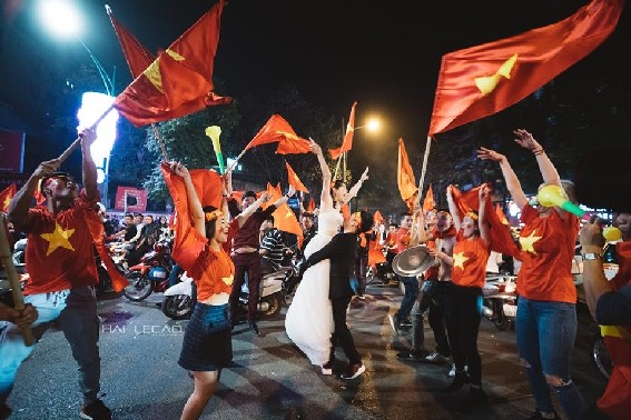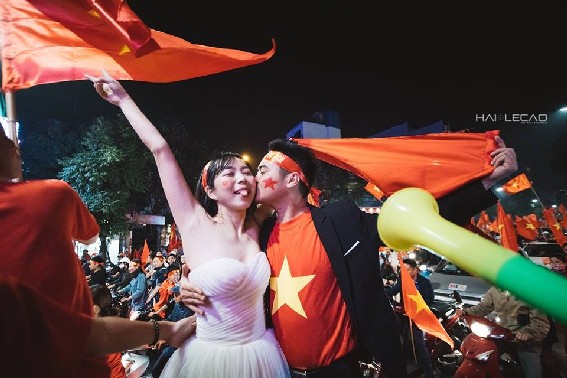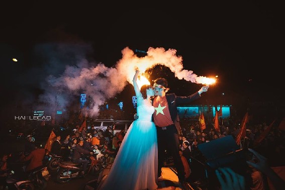Suốt từ thời điểm trận bán kết kết thúc, cư dân mạng chia sẻ với nhau những bức ảnh "đi bão" với băng rôn, khẩu hiệu, cờ đỏ sao vàng, ai cũng tươi cười, rạng rỡ hòa chung vào niềm vui chung của cả nước. Giữa vô vàn những hình ảnh mà mọi người hay gọi vui là "đi bão" đó, xuất hiện bộ ảnh cưới của cặp cô dâu chú rể tạo dáng bên nhau, xung quanh là biển người hâm mộ.