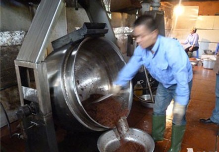 Mỗi ngày, cơ sở sản xuất Kim Chi nằm sát sông Hồng dùng 70kg thịt lợn say sẵn chế biến với mắm tôm, phẩm màu, dầu hào Trung Quốc không rõ nguồn gốc xuất xứ... để cho ra "đặc sản" mắm tép chưng thịt.