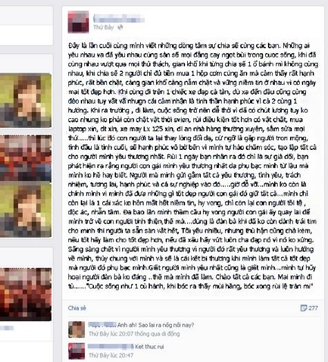 Khuyến còn tâm sự đã gửi gắm tình yêu, trách nhiệm, tương lai và cả hạnh phúc vào Hằng nhưng kết quả lại bị phụ bạc. Cuối bài viết, hung thủ nói lời chia tay với bạn bè: “Cuộc sống như một củ hành bóc ra thấy mùi hăng, bóc xong rồi thấy lệ tràn mi”.