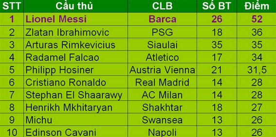 Bởi vậy, nếu xét khả năng cạnh tranh và tính bùng nổ, Messi chỉ còn lo ngại Zlatan Ibrahimovic, người đã có được 18 bàn thắng và đứng ở vị trí thứ 2. Ở giải đấu không quá quyết liệt như Ligue 1, Ibra hoàn toàn có thể nâng cao thành tích ghi bàn của mình khi mùa giải kết thúc. Cũng giống cách tính điểm của La Liga, tiền đạo Thụy Điển được số điểm +2 cho mỗi bàn thắng. Với 18 bàn, anh có 36 điểm, kém 16 điểm.