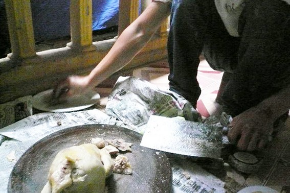 2 giờ sáng có mặt tại cơ sở D.H (đường Hoàng Hoa Thám, quận Ba Đình - Hà Nội) để vận chuyển nguyên liệu chế biến cho “bếp trưởng” tên là Phượng nấu (bếp trưởng là người ở Nam Định, làm nghề chuyên thu mua phế liệu và dọn nhà, được cơ sở này thuê nấu khi có nhiều đơn đặt hàng) 60 mâm cỗ cho 1 đám cưới.