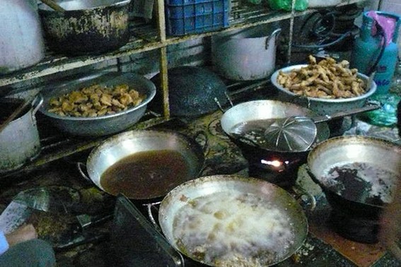 Hãi nhất là những chiếc chảo cỡ lớn dùng để rán cá, tôm, bánh bao đã sử dụng nhiều lần, không cọ rửa, bám mỡ màu đen xì. Do không được đậy nắp, nên trong đáy chảo dầu còn có cả cứt chuột, xác gián chết. Người nấu cứ thế đổ thêm dầu vào rán. Chiếc vợt, muôi sau khi vớt xong họ vứt ngay xuống nền nhà ướt nhoét. Các dụng cụ khác như: Dao, thớt... mốc xanh vẫn còn bám lại thức ăn từ lần nấu cỗ trước, gỉ vàng, nhưng đầu bếp chỉ lau qua loa rồi thái thịt, cắt bóng bì lợn... “Đây mới chỉ rán qua một lượt, rồi mang đến nhà đám rán lượt nữa, nhiệt độ dầu cao vi khuẩn nào chẳng chết, quan trọng là bày món ăn cho ngon, đẹp hài lòng khách” - cô Mơ (bếp phụ) - quát khi tôi thắc mắc về dụng cụ nấu không vệ sinh.