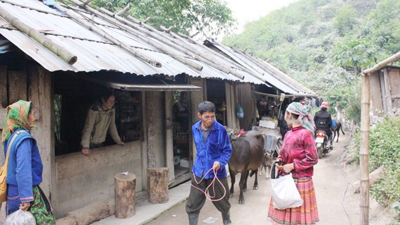 Rẽ vào một con đường mòn chỉ vừa một chiếc xe đi, chúng tôi đến một “phố chợ” nhỏ xinh ấm áp. Mấy gian nhà gỗ nằm kề sát bên nhau, bán đủ mọi thứ nhu yếu phẩm. Bọn trẻ con chạy chơi trên đường líu ríu gọi nhau, có vẻ ít rụt rè hơn vì hay va chạm, tiếp xúc với người ngoài. Mấy người phụ nữ dân tộc Mông xúng xính váy áo ghé vào mua khăn, thấy có máy ảnh giơ lên lập tức ngại ngùng nói mấy câu tiếng bản địa, ý chừng bảo chờ một lát, rồi buộc lại chiếc khăn trên đầu cho gọn.