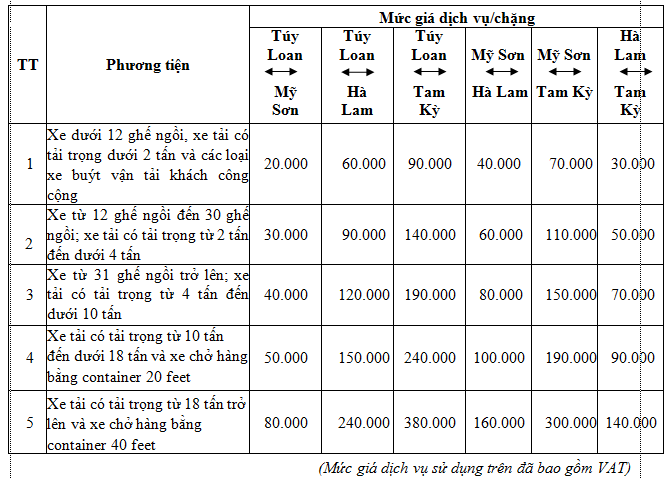 Để thực hiện theo đúng các quy định, VEC ban hành mức giá dịch vụ sử dụng tuyến cao tốc Đà Nẵng - Quảng Ngãi (đoạn Km0 - Km65), giai đoạn khai thác tạm do VEC quản lý vận hành như sau: