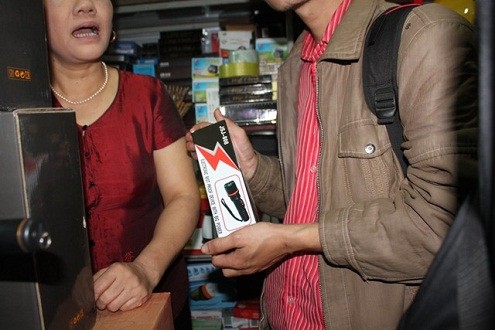Thấy khách vẫn chưa ưng ý, bà Nhung liền lấy chiếc hộp giống hộp đựng đèn pin ra giới thiệu, đây là loại dùi cui điện đèn pin, loại này vừa làm đèn pin chiếu sáng buổi tối, vừa dùng làm công cụ phòng thân rất hiệu quả, giá 500.000 đồng mỗi cái, lấy hai cái thì 900 ngàn đồng. Bà Nhung cho hay, loại này tầm sát thương 1m và hiệu quả hơn dùi cui điện thoại.