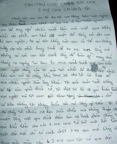 "Con đã suy nghĩ nhiều cách lắm mà vượt qua không được nên phải tìm đến cái chết. Chồng con ép đến đường cùng nên phải hy sinh cả ba mẹ con vì nếu sống mà không có các con bên cạnh thì sống làm gì. Mang thai chín tháng mười ngày sao họ nỡ chia cách tình mẹ con của con", Phương viết.