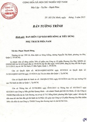Trong đơn khiếu nại, ông Dũng cho biết, mặc dù được ủy quyền là người đại diện theo pháp luật của Công ty Phạm Phú Gia nhưng từ tháng 12/2013 cho đến nay, ông Bùi Thiên Thư không tham gia điều hành công ty, công ty nhiều lần mời họp nhưng không đến và không thể liên hệ.