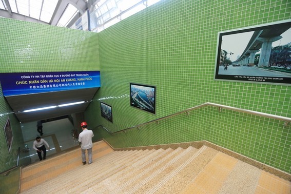 Thang bộ dẫn lên tầng 3 của nhà ga La Khê với những tấm ảnh giới thiệu về quá trình xây dựng toàn tuyến đường sắt đô thị được chú thích bằng song ngữ Việt - Trung.