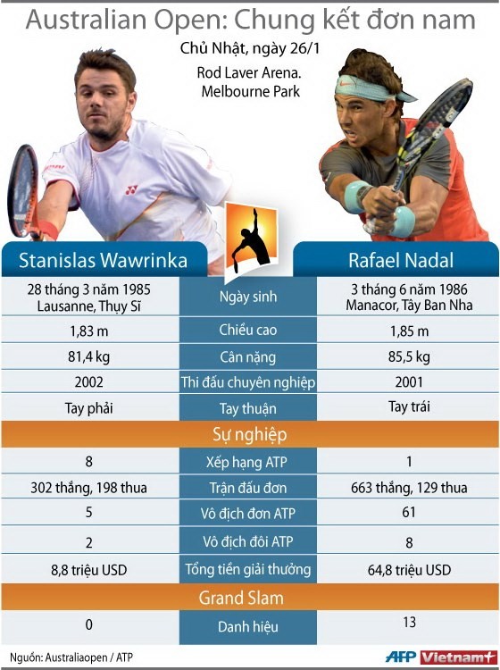 Rafael Nadal đang chiếm ưu thế truyệt đối và khả năng anh sẽ lần thứ hai lên ngôi tại Australian Open là điều không phải bàn cãi. Tuy nhiên, tất cả đều đang rất mong chờ Stanislas Wawrinka sẽ tạo nên màn lật đổ kỳ vĩ trước "ông vua sân đất nện" tại Melbournen trong lần đầu tiên dự một trận chung kết thuộc giải Grand Slam danh giá.