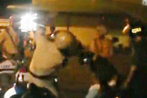 Hình ảnh ghi trong clip cho thấy, có nhiều cảnh sát đứng xung quanh 2 thanh niên có biểu hiện say xỉn. Sau đó, một cảnh sát đã vung tay đánh, khống chế hai thanh niên nói trên.