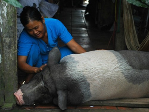 Khi chúng tôi bước vào nhà, bất ngờ một con heo xuất hiện với bộ dạng hung hăng như xua đuổi người lạ mặt. Ông Mạo nói: “Nhà có khách, nhà có khách...” thì chú heo mới bớt thể hiện sự hung dữ. Theo ông Mạo, con heo nói trên mua của một người bán dạo, cách nay hơn 3 năm đến nay con heo nặng gần 150kg (giống đực, thuộc loại heo rừng).