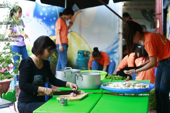 Vào buổi sáng của một ngày Chủ nhật, chúng tôi đã may mắn được tận mắn chứng kiến không khí làm việc hăng say của nhóm nấu cơm từ thiện tại Trường mầm non Tú Chi. Sau khi dậy từ rất sớm, đi chợ mua đầy đủ nguyên liệu đều là đồ tươi ngon, nhóm từ thiện gồm 10 thành viên của chị Loan khẩn trương bắt tay vào công đoạn chế biến. Một không khí làm việc rất khẩn trương, vừa làm, vừa cười đùa, kể cho nhau nghe những câu chuyện thấm đẫm tình người. 8h sáng, nấu nướng xong xuôi, sau khi đã chia thành các suất, nhóm làm phiếu rồi mang đi phát cho các bệnh nhân. Việc phát phiếu diễn ra rất nhanh, chỉ trong vòng 30 phút, do bệnh nhân ở đây đều đã quen thuộc với chương trình cơm từ thiện nên chào đón rất nhiệt tình. Nhìn hình ảnh các bệnh nhân đón nhận suất cơm từ thiện với đôi bàn tay run run, vẻ mặt đầy xúc cảm, những người có mặt như chúng tôi bỗng dưng thấy nghẹn ngào.