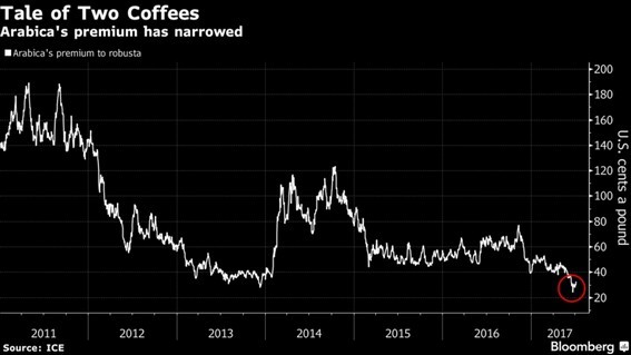 Trong tháng 6, giá robusta tăng mạnh vì lo ngại thiếu hụt nguồn cung, khiến chênh lệch giá giữa hai loại cà phê này xuống thấp nhất kể từ năm 2008. Chênh lệch giá càng hẹp thì các doanh nghiệp rang xay cà phê trên thế giới càng có xu hướng sử dụng arabica thay robusta, ông Reiner cho biết.