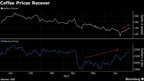 Xét về giá cà phê, giá arabica chốt cuối tuần trước, kỳ hạn phục hồi khoảng 12% sau khi chạm đáy 15 tháng hồi tháng 6. Tương tự, giá robusta kỳ hạn cũng tăng 15% từ đáy 7 tháng được ghi nhận vào tháng 4.
