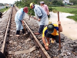 Công nhân đường sắt tiến hành khắc phục, sửa chữa những đường ray bị sạt lở. (Ảnh: Trần Lê Lâm/TTXVN)