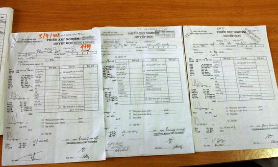 Ba kết quả xét nghiệm khống của bệnh nhân 40 tuổi mắc bệnh tâm thần, bệnh nhi 3 tuổi bị viêm phế quản và bệnh nhi 1 tuổi bị tiêu chảy có cùng chỉ số sinh hóa và huyết học. (Ảnh: Dương Ngọc/TTXVN)
