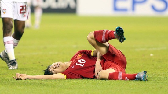 | Thêm một tin không vui cho U23 VN khi ở phút đá bù giờ thứ hai, Công Phượng đã dính chấn thương trong tình huồng va chạm với hậu vệ UAE và ngã xuống với một lực khá mạnh. Pha tiếp đất khiến Công Phượng phải nằm bất động và được bác sĩ dùng xe chuyên dụng đưa ra khỏi sân. |