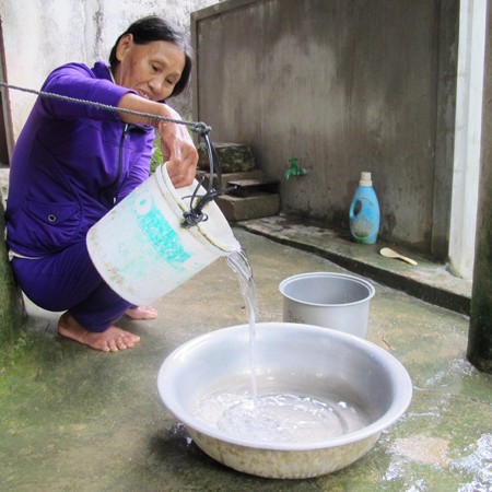 Để có nước sạch sử dụng, hàng ngày chị Nguyễn Thị Minh (thôn Biểu Lệ) phải lọc qua nhiều công đoạn.