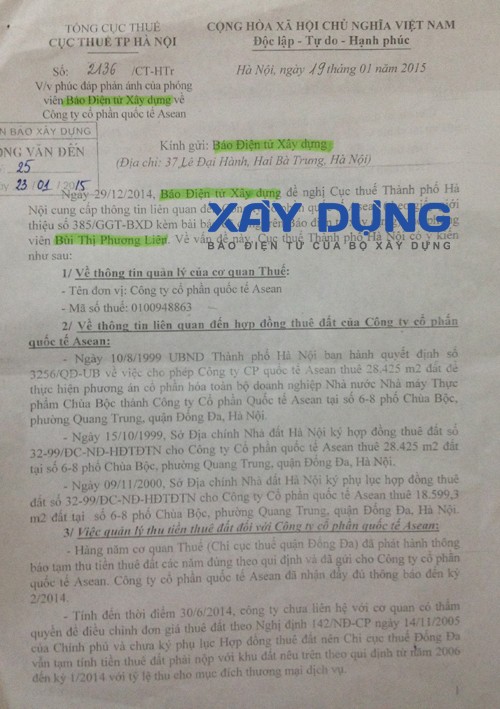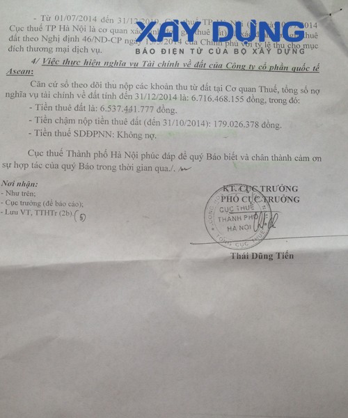 Công văn số 2136/CT-HTr của Cục thuế TP Hà Nội ngày 19/1/2015 phúc đáp phản ánh của Báo Điện tử Xây dựng nêu rõ: Hàng năm cơ quan thuế (Chi cục thuế quận Đống Đa) đã phát hành thông báo tạm thu tiền thuê đất các năm đúng theo quy định và đã gửi cho Công ty CP Quốc tế Asean. Công ty Asean đã nhận đầy đủ thông báo đến kỳ 2/2014.
