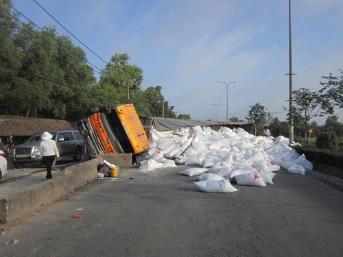Rất may vụ tai nạn không gây tổn thất về tính mạng, tuy nhiên xe container bị hư hỏng nặng, cầu trước gãy rời, hàng chục tấn tinh bột khoai mì đổ tràn trên đường.