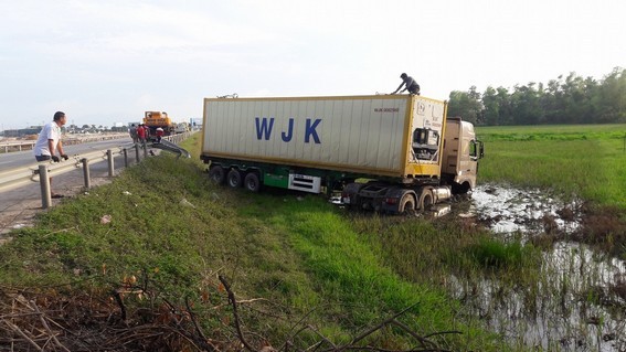 Chiếc xe container nổ lốp trước lao xuống ruộng. Ảnh Hoài Nam