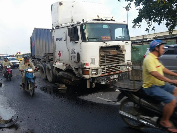 Tài xế xe container buồn ngủ lao vào dải phân cách trên đường, khiến giao thông bị ùn tắc trong nhiều giờ đồng hồ.
