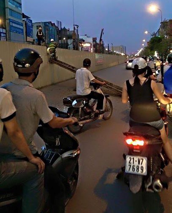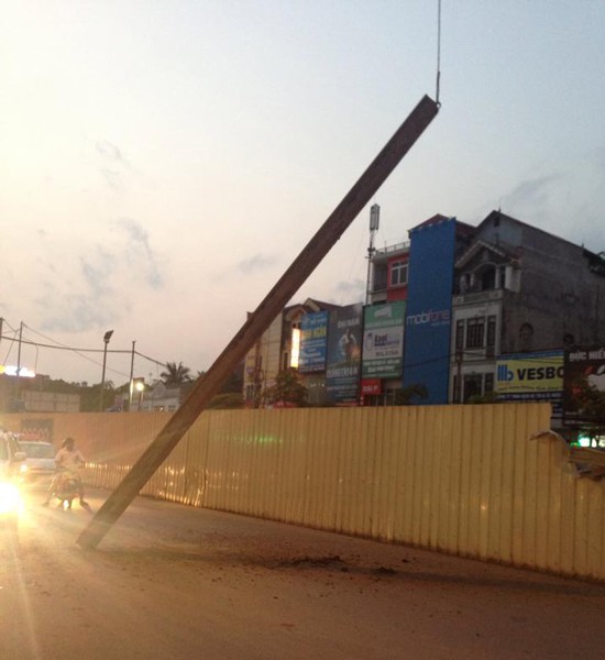 Theo thông tin mới nhất, cột thép này được đơn vị thi công cẩu lên để thực hiện việc đóng xuống lòng đất. Tuy nhiên, đúng lúc cẩu lên thì gặp sự cố, khiến thanh thép bị rơi xuống trong tình trạng một đầu đập xuống phần đường dành cho người đi xe máy, ô tô, phần kia gác lên rào chắn công trình.