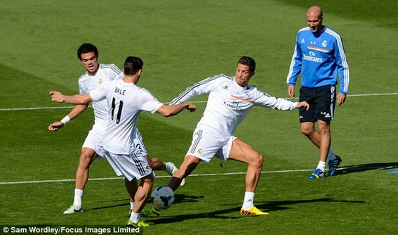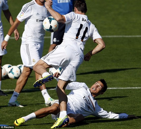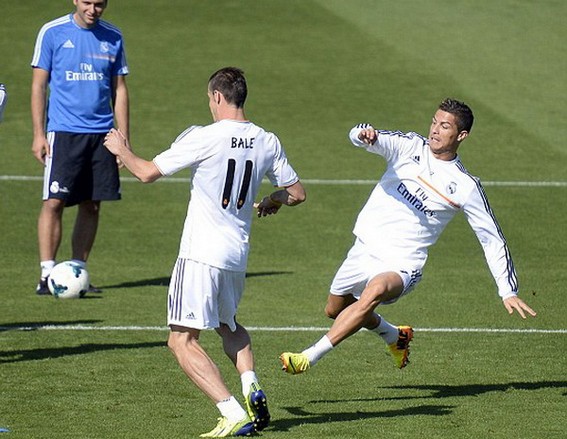Trong buổi tập sáng nay, Ronaldo đã có ít nhất ba lần phô diễn "kỹ năng" xoạc và tắc bóng nhằm vào Bale - người đã soán ngôi vị cầu thủ đắt giá nhất trên thị trường chuyển nhượng với mức giá 100 triệu euro.