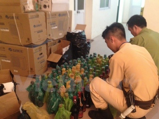 Lực lượng công an và quản lý thị trường Hà Nội đang kiểm tra số rượu ngoại tạm giữ (Ảnh: Đức Duy/Vietnam+)