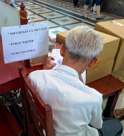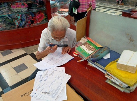 Trong lúc trò chuyện thì ông có khách - một cụ bà khoảng hơn 70 tuổi, ông bảo đây là khách quen mười mấy năm rồi, chủ yếu là điền vào giấy tờ để bà gửi hàng sang bên Mỹ cho người quen. Ông chăm chú dùng kính lúp soi từng chữ, tay còn lại chậm rãi viết đều. “Cứ vài tuần là tôi lại ra đây nhờ ông điền giúp mấy cái đơn gửi hàng. Suốt hơn chục năm, chưa bao giờ hàng của tôi bị thất lạc”, người khách tên Thủy tâm sự.