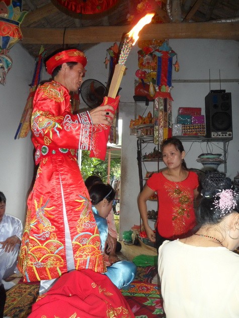 Dưới tiếng nhạc nỉ non và giọng hát kể lể trong chiếc đĩa hát đang mở, “cậu đồng Hiển” trạc 40 tuổi da trắng, môi đỏ, dáng đi ẻo lả xuất hiện trong trang phục lụa trắng toát từ chân tới đầu ra đón đoàn chúng tôi. Vừa bắt tay, miệng cậu liên tục chỉ chỗ đặt lễ lạt cùng những voi, ngựa, hình nhân thế mạng bằng giấy để những “con nhang đệ tử” trong đoàn chúng tôi bưng vào.