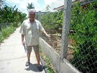 Ông Thanh chỉ phần đất dài 200 m của gia đình ông nhường để mở rộng đường. Ảnh: CHÂU THÀNH.