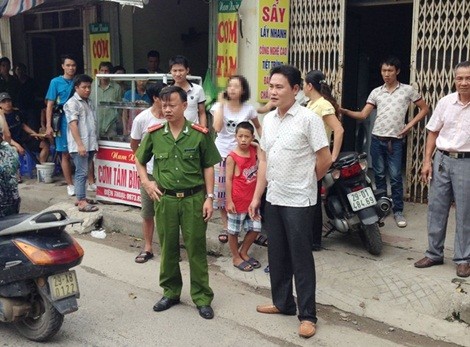 Công an phường Định Công kiểm tra hiện trường nơi xảy ra cãi vã, trước khi ông Thanh bị đối tượng lạ mặt dùng hung khí tấn công