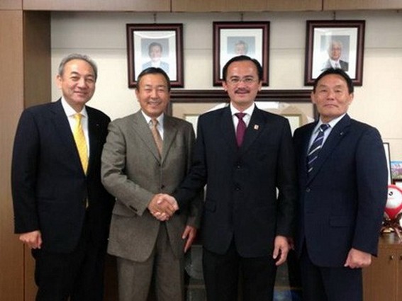 Ông Koji (áo vét xám, ở giữa) bắt tay chủ tịch VPF Võ Quốc Thắng. (Nguồn: VFF)
