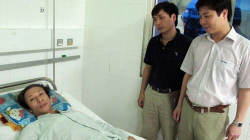 BS Trần Thúc Khang (giữa) và BS Phan Hải Thanh thăm bệnh nhân Đồng Đức Lợi