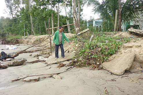 Đặc biệt, đến mỗi mùa mưa bão, sóng đánh sâu vào hàng chục mét gây sạt lở các nền, sân nhà dân, nước biển tràn vào lênh láng, khiến nhiều người rất lo sợ. Con đường bê tông do người dân xây dựng phục vụ việc đi lại và những hàng cây thông, dương liễu được trồng để chắn sóng cũng bị sóng biển đánh gãy đổ trơ trọi trên cát.