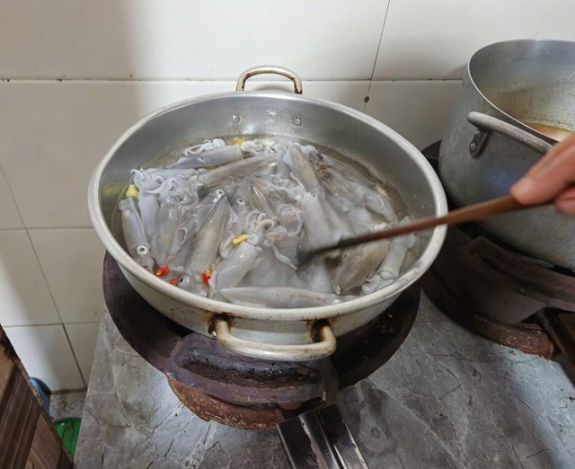 Mực sẽ được luộc cùng với gừng và ớt đảm bảo vẫn giữ được nguyên vị tươi ngon của nó
