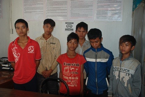 6 đối tượng ném đá xe khách bị bắt tại Công an xã Quảng Tín. Ảnh: Quỳnh Anh