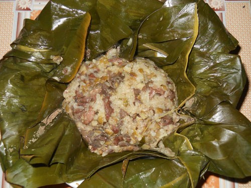 Công đoạn vất vả nhất là gói những đùm mọc sao cho vừa bắt mắt lại không bị vào nước khi hấp. Thường thì người dân quê tôi chọn lá chuối hơ qua lửa, lau sạch hai mặt, cắt gân lá cho lá mềm. Đặt 2 miếng lá chuối bản rộng song song, thoa qua một lượt dầu phụng đã phi chín giúp mọc không dính vào lá và tăng thêm vị béo. Xúc nguyên liệu đã trộn cho vào giữa lá và túm lá chụm lại một đầu. Gói tiếp bằng vài ba miếng lá bên ngoài, rồi dùng bẹ chuối khô tước nhỏ thành sợi cột chặt lại. Khi gói phải chặt tay, để lúc thành phẩm mọc mới rền, dẻo, không méo mó. Xong xuôi đem mọc vừa gói cho vào nồi hấp cách thủy bằng cách dùng một miếng vỉ nan tre đan đặt vào nồi, trong nồi đặt 4 ống tre đỡ tấm vỉ lót. Canh nước sao cho trong quá trình hấp, nước không tràn lên vỉ. Sắp một lớp lá chuối lên vỉ trước khi đặt từng gói mọc vào. Đun liên tục chừng non tiếng đồng hồ thì mọc chín.