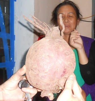 Sau bão Haiyan, vườn rau khoai lang bị gió đánh tơi tả nên bà Câu ra đào lấy củ thì có rất nhiều củ có hình quả dừa nhưng chỉ có một củ nặng gần 3kg này.
