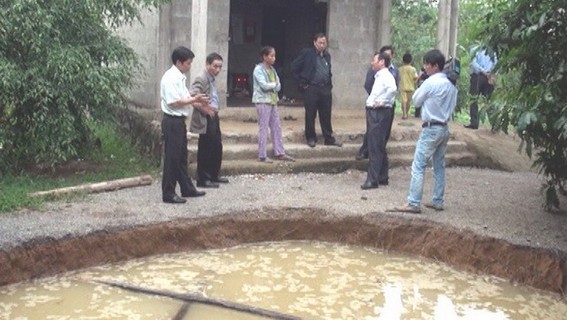 Trước mắt người dân lấp đất đá vào "ao" để chống sạt lở rộng, còn các cơ quan chức năng sẽ kiểm tra để có kết luận chính xác về nguyên nhân đất sụt.