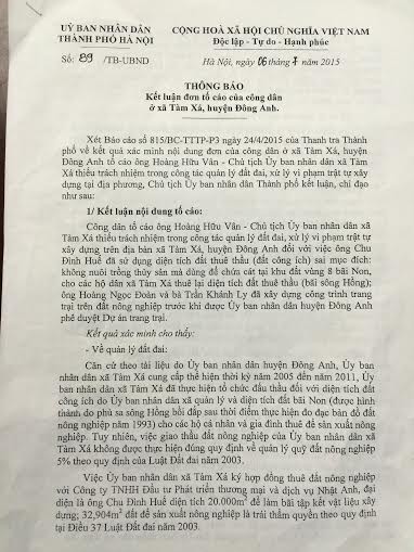Ngày 6/7, UBND TP Hà Nội đã ra thông báo kết luận đơn tố cáo ở xã Tàm Xá, huyện Đông Anh. Văn bản số 89/TB-UBND do Phó Chủ tịch UBND TP Hà Nội Vũ Hồng Khanh ký ban hành thông báo kết luận kết quả xác minh tố cáo đối với ông Hoàng Hữu Vân – Chủ tịch UBND xã Tàm Xá dựa trên báo cáo của Thanh tra TP Hà Nội.