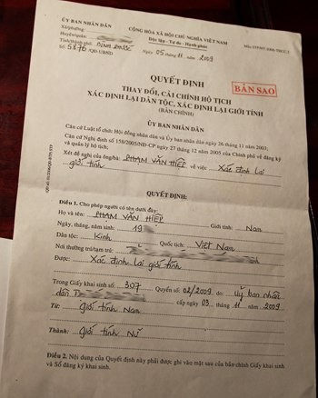 Quyết định "xác định lại giới tính" từ nam sang nữ do chính quyền địa phương cấp cho Trâm với tên cũ là Phạm Văn Hiệp (một số thông tin cá nhân được làm mờ theo yêu cầu của nhân vật).