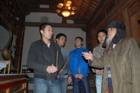 Nhiều bạn trẻ cũng tìm đến cụ Nguyễn Văn Minh (ngoài cùng bên phải) nghe kể chuyện kho báu với “hồn ma trinh nữ”.