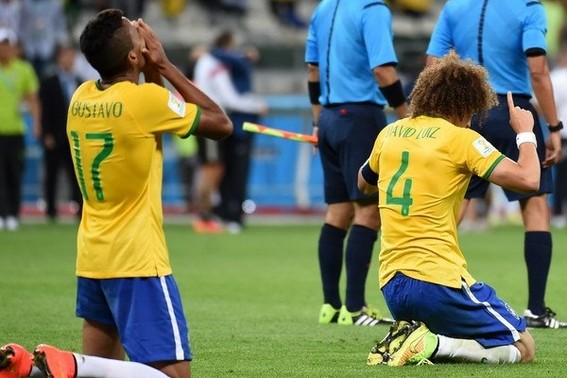 Nỗi buồn bại trận của hậu vệ Brazil David Luiz (phải) và trung vệ Luiz Gustavo sau trận thua cay đắng của đội nhà. (Nguồn: AFP/TTXVN)