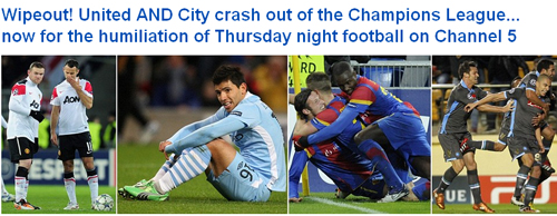 Tờ BBC đặt hàng tít lớn “Man Untied sững sờ với thất bại và bị loại”. Tờ Mail in đậm: “Sạch bóng! Man United và Man City cùng bị loại khỏi Champions League… và giờ là nỗi nhục của trận đấu tối thứ Năm trên kênh 5”.
