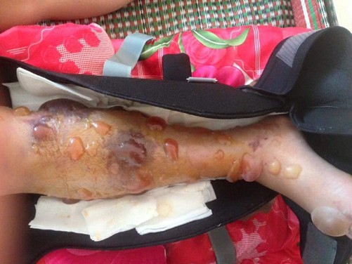 Chân phải của em Vi bị hoại tử trước khi cắt bỏ